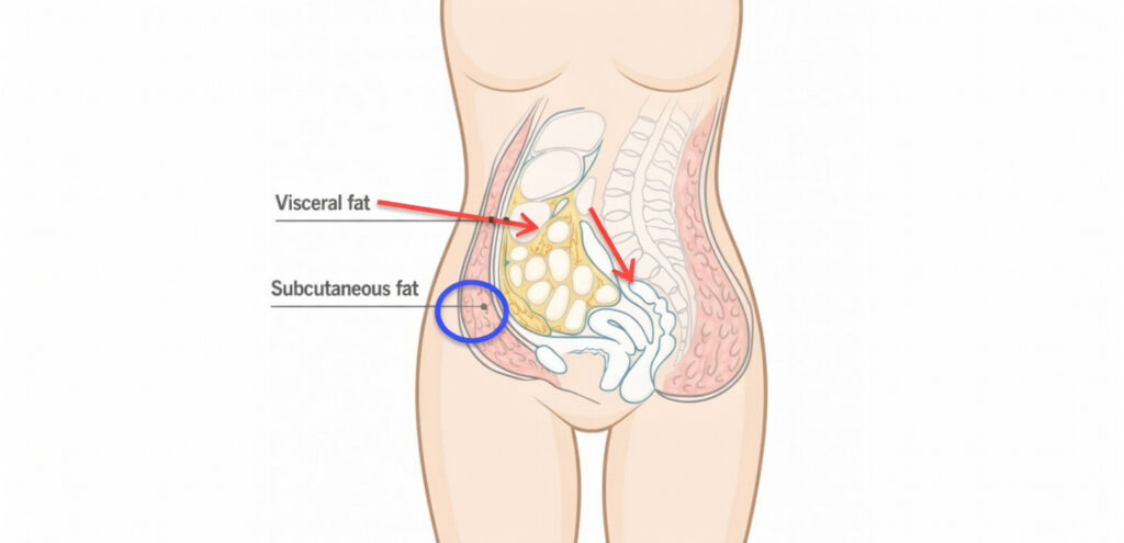 Visceral fat is stored deeper in the abdominal cavity, surrounding your internal organs.