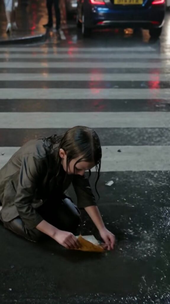 She lunged into the roadway without thinking. Knees hit the cold water, hands slapped against the shining surface, and for a moment she looked like she was drowning on dry land. She fumbled for the paper, sliding it onto her palm with reverence, trying to lift it from the rain as if she could pull it back in time. Her lips moved around words no one could hear, then a whisper broke through, ragged and raw: her mother had told her that a man who carried a silver umbrella needed to see the message, that it was the only way to find him again.
