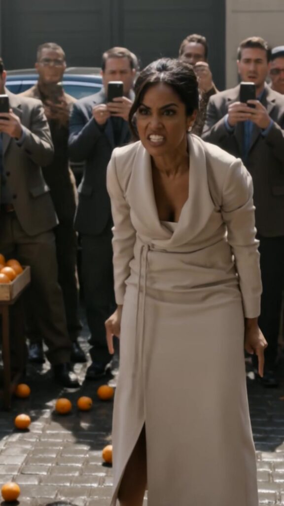 A woman in a tailored coat the color of spilled wine surged forward with a violence that made strangers recoil. She grabbed another woman—slender, carefully dressed but worn at the seams—by the hair and hauled her backward. The dragged woman’s heels skidded; her palms slapped wet stone. Baskets toppled. Tangerines burst free like small suns, rolling under boots and cart wheels. The wealthy woman’s face was hard with fury, the kind that had been practiced in boardrooms and private dining rooms, now unleashed in public.