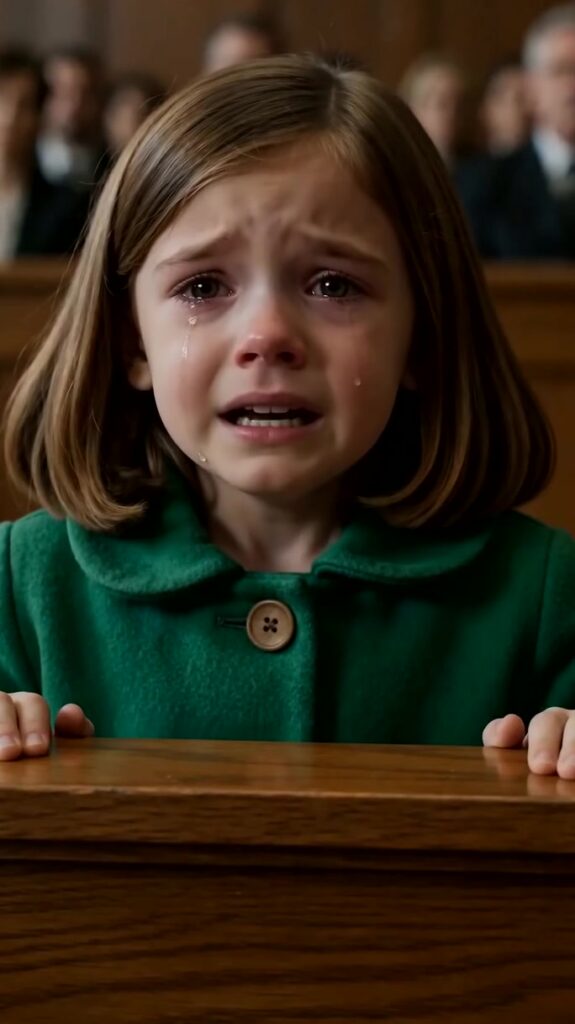 At the front, a child stood too small for the architecture. She wore an emerald coat so bright it looked defiant against the varnished wood and gray suits. Her fingers were braced on the witness bench, tiny knuckles whitening as if she could anchor herself by force. She had been told to wait outside, but she had slipped in anyway when the bailiff turned to open a side door. Now she stared at the judge like the judge was the last light left on an emptied street.