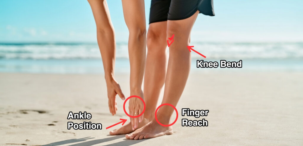 Although it looks simple, this movement is often done incorrectly. It is not just about reaching your fingers toward your feet. The real goal is to stretch the entire backside of the body, including the soles of the feet, calves, hamstrings, and lower back.